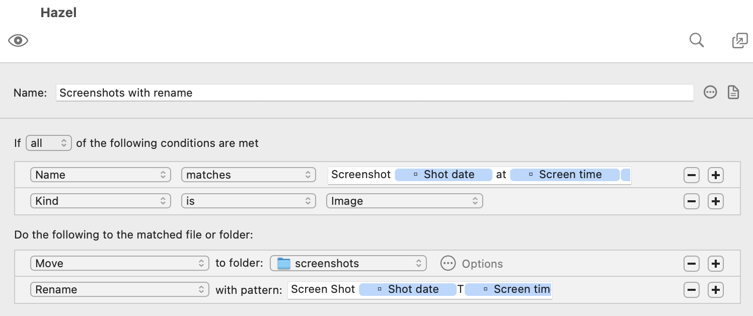 For a long time I haven’t liked how MacOS clutters the desktop with screenshots and I don’t like the naming convention it uses for these files. So I have a Hazel rule that watches my Desktop folder for screenshots, then renames them “Screen Shot YYYY-MM-DDTHH.MM.ss.png” and moves them to a dedicated screenshots folder.